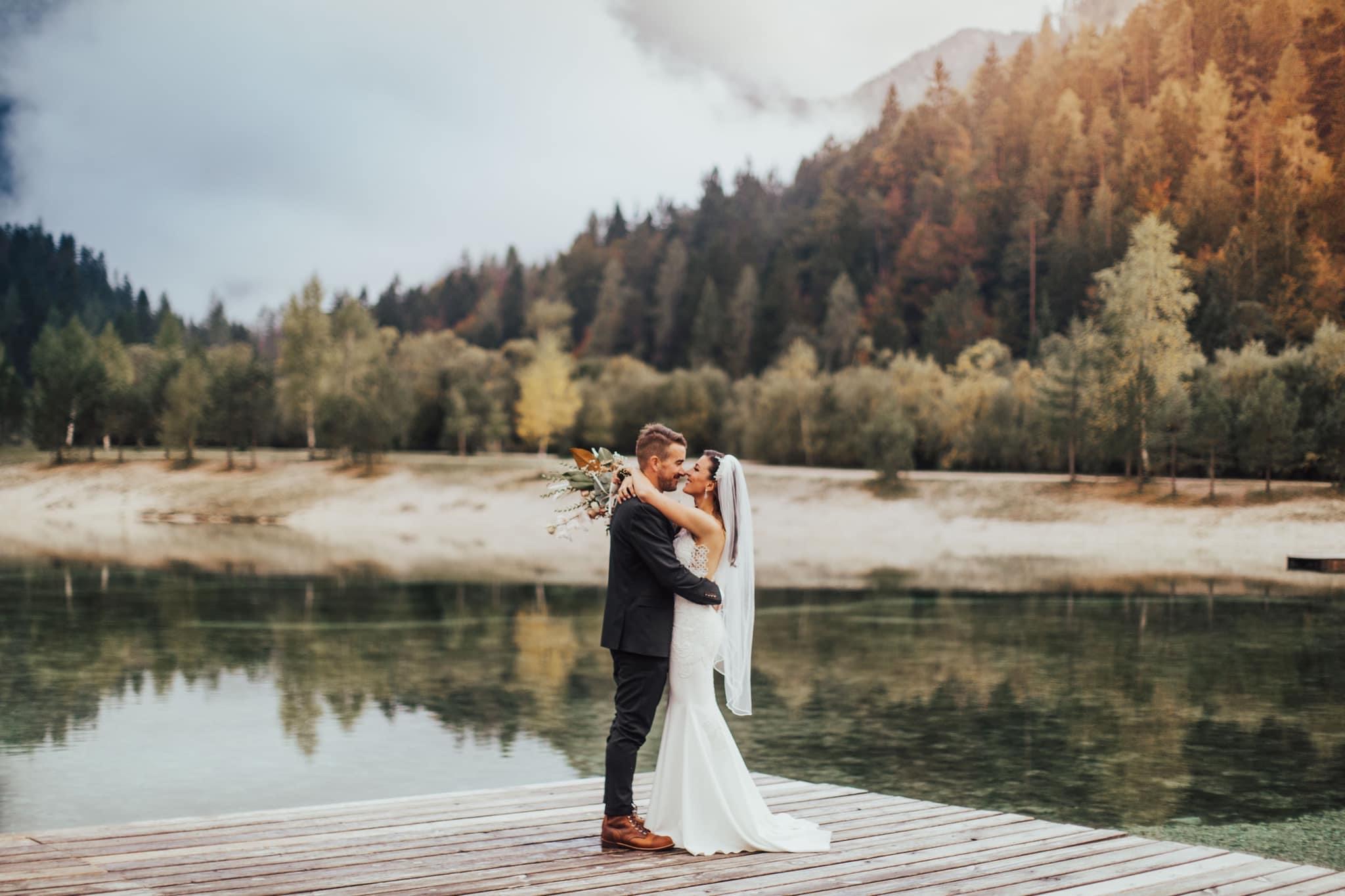 Painting of a bride and groom embracing on a dock by a lake with autumn trees in the background